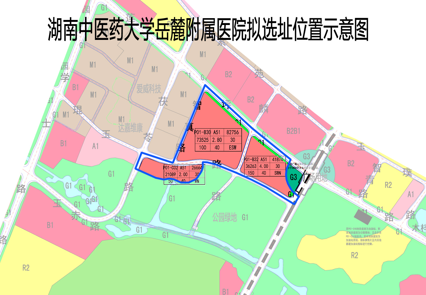 宗地三:位于茯苓冲路与琨玉路交汇东南角,总用地面积40亩,净用地面积31.6亩,用地性质为医疗卫生用地,容积2.0,限高50米,建筑密度30%,绿化率40%。该地块规划在3年内投资2亿元建设集临床教学、科学研究、产业开发和业务培训等功能于一体的产学研中心。